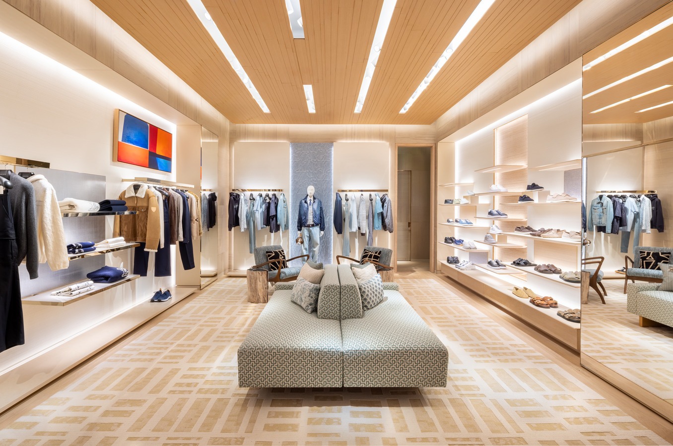 Step inside, and you’re immediately transported to the likes of a Mediterranean Revival–inspired white stucco façade gives way to a warm, meticulously detailed interior: European oak floors, sunlit wooden portals, and a flow of intimate rooms that make the space feel more like a beautifully curated home than a store. A sculptural wood staircase climbs to the second floor—wrapped in custom dégradé wallpaper that makes the ascent feel like a moment in and of itself.